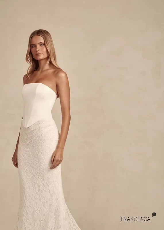 FRANCESCA ist sowohl als Kleid, als auch als Zweiteiler erhältlich. Ganz wie du möchtest, kannst du zu der zauberhaften Corsage den für dich passenden Rock wählen. Ich liebe Mix & Match. Die Corsage ist gerade und schlicht geschnitten. Der Rock ist aus glattem Crepe passend zum Oberteil. Alternativ kannst du auch einen Rock aus Spitze wählen (nicht vor Ort).
