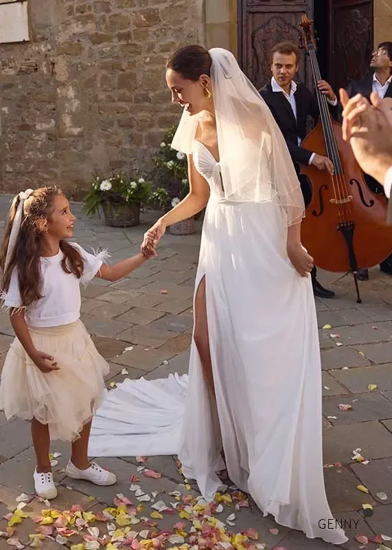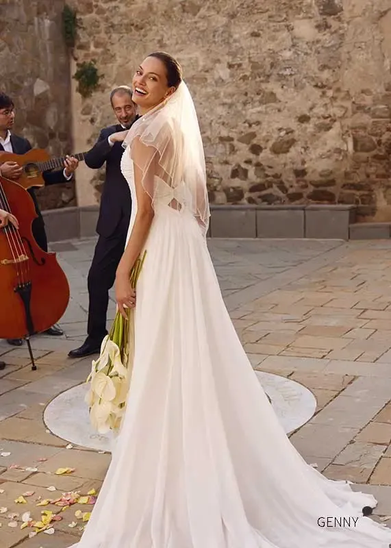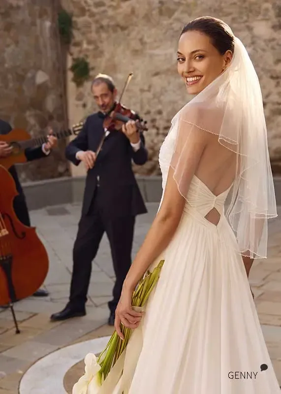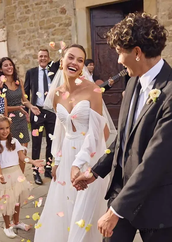 GENNY ist ein schlicht gehaltenes und leichtes Brautkleid. Das trägerlose Kleid wird mit zarten und luftigen Ärmeln kombiniert, die abnehmbar sind.