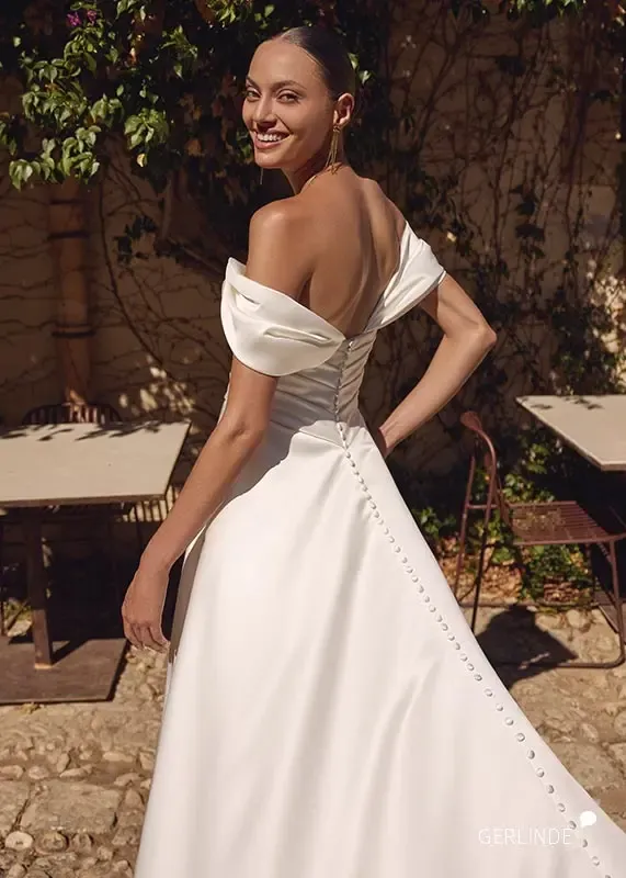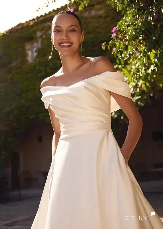 GERLINDEein Brautkeid im CLEAN CHIC Style mit einer schönen Drappierung am Oberteil. Ein absoluter Hingucker sind die Carmenträger, die eine besondere Elegant verleihen.