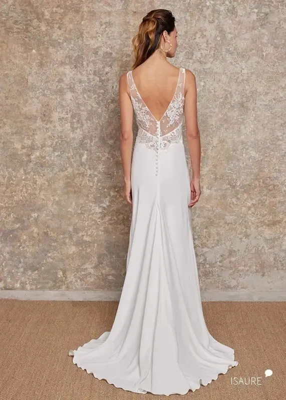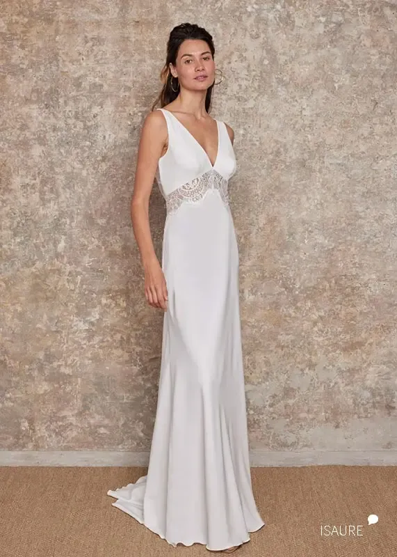ISAURE hat einen V-Ausschnitt im Vorderteil und auch im Rücken. Die Spitze ist nur akzenturiert eingesetzt und verleiht dem Rücken eine besonders schöne Silhouette.