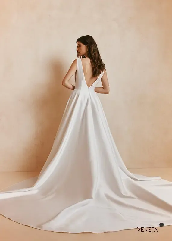 VENETA von Anna Kara ist auf den ersten Blick so schlicht und es ist einfach sooooo besonders! Ein tiefer Ausschnitt sowohl im Vorder- als auch im Rückenteil. Das Rockvolumen ist perfekt für den modernen Prinzessinnenlook.